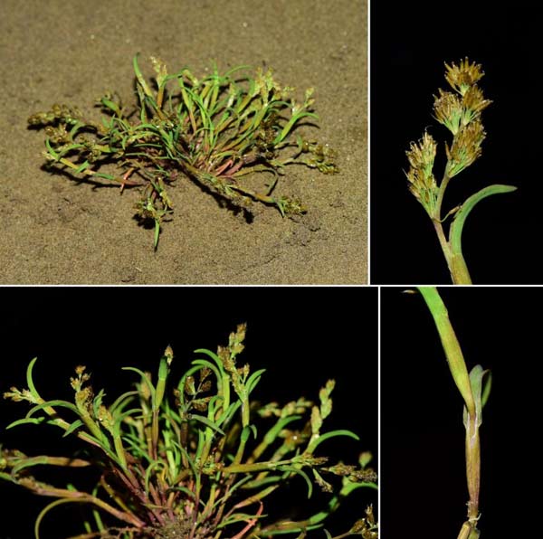 3月18日,“大别山区生物多样性综合科学考察”项目中承担植物多样性调查任务的考察队,在大别山西片区的黄冈市浠水县开展植物调查时,在长江沙滩地上发现禾本科(Poaceae)一特殊物种——莎禾(Coleanthus subtilis (Tratt.) Seidel)(图1)。该物种属于莎禾属(Coleanthus),本属仅包含莎禾一种,为禾本科中的单种属。莎禾是一种一年生草本植物,其生命周期仅持续几周。据《中国植物志》记载,莎禾分布于欧亚大陆的寒温地带,在我国产于东北各省及江西。由于该物种在国内被记载的分布模式比较特殊,《中国植物志》该属的编著者方文哲先生在记载本植物时指出:全国主要大的标本室收藏此种标本者极少,对本种在我国的分布情况,尚须进一步调查研究方能搞清。并怀疑:《禾本科图说》中记载在江西九江地区采得的本种标本也可能系“输入者”。当前,在中国数字植物标本馆官网(CVH)上仅能查到1959年及之前采集的少数标本。而在中国植物图像库(PPBC)官网尚未见到有研究人员或植物爱好者上传莎禾的野外生境照片,莎禾的分布信息极其匮乏。记载江西有莎禾分布的凭证标本采集于1921年,距本次在长江流域再次采集到本植物相隔了整整一百年。本次于湖北省浠水县发现的莎禾属,为大别山区植物新记录属,丰富了大别山区物种多样性资料,同时也为莎禾在长江流域可能为自然分布提供了新的证据。