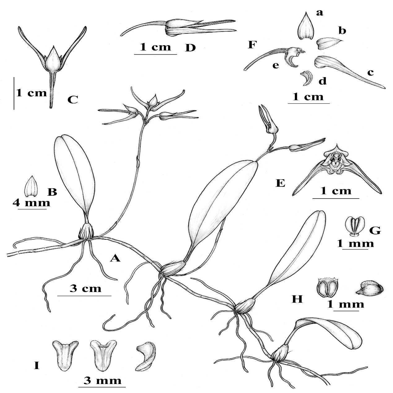 近日,中国科学院武汉植物园胡光万研究团队与四川卧龙国家自然保护区工作人员在四川卧龙国家自然保护区发现并联合命名了兰科植物一新种——卧龙卷瓣兰(Bulbophyllum wolongense G.W. Hu, Yue H. Cheng & Q.F. Wang)(图1)。这是该研究团队继发表中华珊瑚兰(Corallorhiza sinensis G.W. Hu & Q.F. Wang)、卧龙无柱兰(Ponerorchis wolongensis G.W. Hu, Yue H. Cheng & Q.F. Wang)以及雅江舌喙兰(Hemipilia yajiangensis G.W. Hu, Jia X. Yang & Q.F. Wang)之后,第四次命名发表四川兰科植物新种。相关研究以《Bulbophyllum wolongense, a new Orchidaceae species from Sichuan Province in China, and its plastome comparative analysis》为题发表在SCI期刊《Ecosystem Health and Sustainability》上。