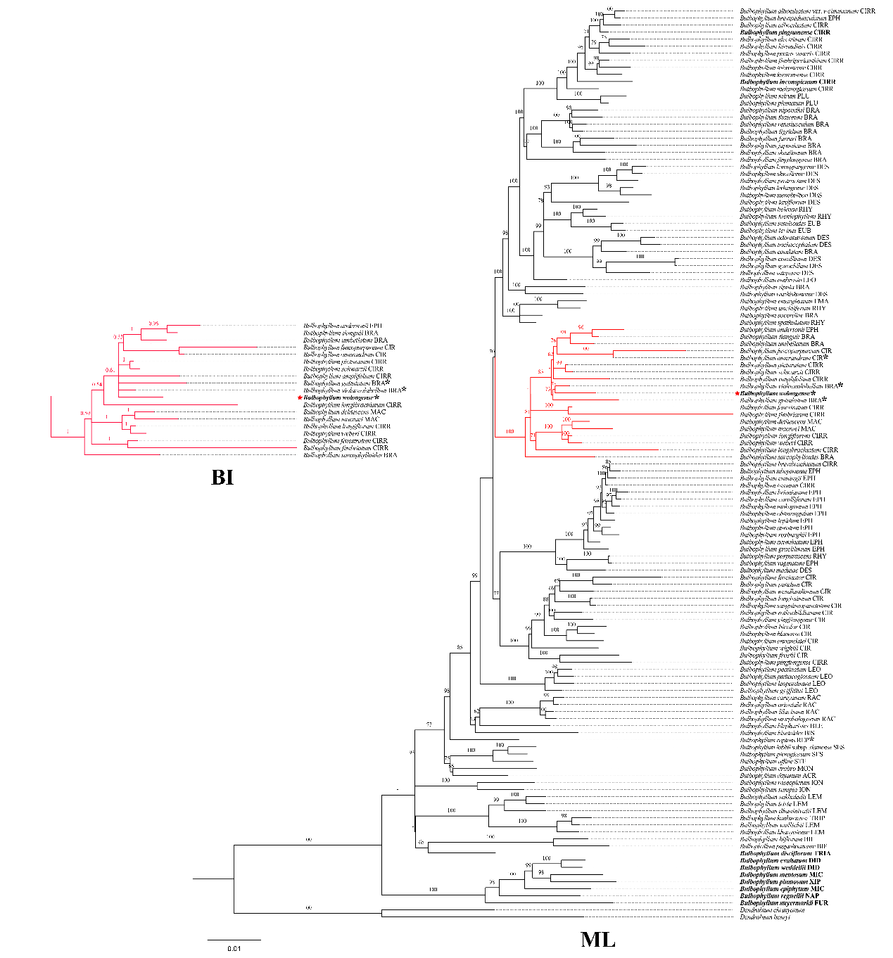 图3 含卧龙卷瓣兰的ML树(基于ITS、Xdh、matK和psbA-trnH片段构建)