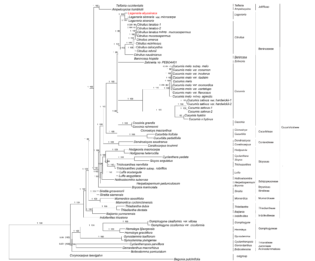 葫芦科(Cucurbitaceae)作为被子植物中重要的经济类群,包含95属900余种植物,其中瓜类作物具有重要的农业经济价值。葫芦属(Lagenaria)为该科的代表性属,共包含6个物种,但仅有葫芦(Lagenaria siceraria)被广泛栽培利用。葫芦属的东非葫芦(Lagenaria abyssinica)因其药用价值和作为传统容器的实用功能而备受关注。然而,该物种的遗传信息尚未见报道,这严重制约了对其系统进化地位以及种质资源利用等方面的深入研究。