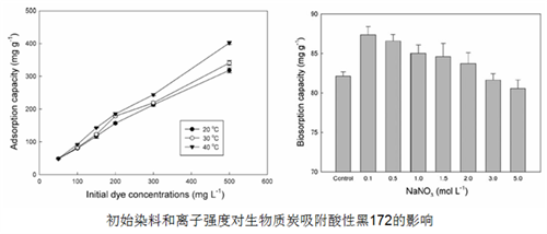 武汉植物园污染生态学科组杨玉义博士在王俊研究员的指导下,采用竹子来源的生物质炭吸附水体中重金属镉复合染料酸性黑172(C.I. Acid Black 172)。研究结果发现Freundlich等温吸附平衡方程比Langmuir等温吸附平衡方程更适合拟合生物质炭吸附酸性黑的过程,意味着生物质炭是不均质表面。在pH 1.0,温度40oC,初始染料浓度500 mg L-1的条件下,竹制生物质炭对染料酸性黑172的吸附量高达401.88 mg g-1。假二级和Weber–Morris模型的吸附动力学研究发现,内部扩散不是限速的唯一步骤。在本实验中,我们发现竹制生物质炭在高离子浓度条件(5.0 Mol NaNO3)下依然对染料具有较高的吸附能力。通过神经网络分析发现温度是影响竹制生物质炭吸附重金属镉复合染料酸性黑的首要因素,其后依次为时间、离子强度、pH和初始染料浓度。本实验为竹制生物质炭在印染废水处理中的应用提供了重要参数的指导。