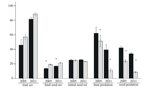 湿地生态学学科组以大王马先蒿(Pedicularis rex)为材料,通过两年的研究揭示了植株密度对大王马先蒿的传粉成功、生殖成功以及种子被啃食程度的影响。结果表明两年中密度对大王马先蒿的受粉率、种子被啃食前的坐果率和结实率均没有影响。然而,自然条件下大王马先蒿的种子被啃食的情况很严重,并且稀疏斑块中的植株种子被啃食的频率显著高于密集斑块;其结果就导致稀疏斑块中植株的最终的结实率显著降低。我们的研究揭示出:大王马先蒿居群不存在传粉者介导的阿利效应,但确实存在种子啃食者介导的阿利效应发生;我们的研究为植物中同样存在捕食作用介导的阿利效应提供了一个有力的证据。
