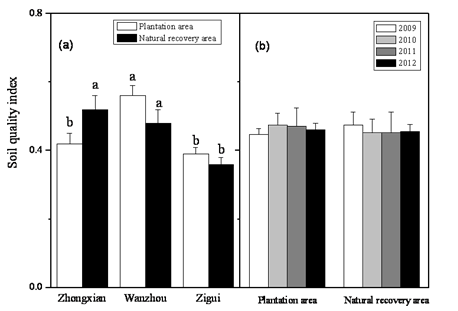 为了研究不同植被恢复方式包括人工植被恢复和自然恢复对三峡库区消落区土壤质量的影响,武汉植物园系统生态学科组叶琛博士在张全发研究员指导下开展了对此项目的研究,通过对三峡库区消落区人工植被恢复区(包括忠县、万州和秭归)与自然恢复区的土壤质量进行对比分析,探讨不同植被恢复方式对土壤质量的影响机制。研究发现,不同的植被恢复方式对土壤质量的影响作用不同,人工植被恢复区中土壤的有机质和硝态氮的含量较高,而自然恢复区中土壤的pH值、容重和总钾的含量较高。然而,不同植被恢复方式对物种的丰富度和多样性以及微生物的群落结构没有显著的影响。利用土壤质量模型分析不同植被恢复方式对土壤质量指数的影响发现,自然恢复区中拥有较高草本植物覆盖度的土壤,它的土壤质量指数较高。这主要是因为较高盖度的草本植物能够提高土壤的有机质和氮含量,同时草本植物拥有大量的较细的根系,根系分泌物能够提高土壤的理化性质,进而提高土壤的质量。该研究结果揭示了三峡库区消落区具有高盖度的草本植物具有较高的土壤恢复潜力。