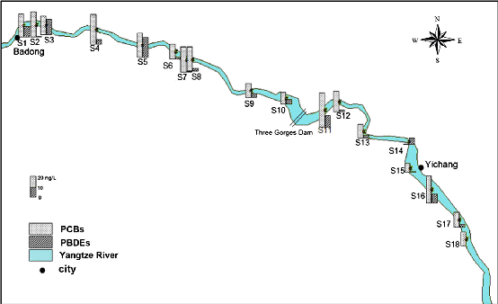 武汉植物园污染生态学学科组葛静博士在王俊研究员的指导下,研究了32种PCBs和10种PBDEs在长江三峡库区表层水中的浓度水平、分布和生态风险。通过T检验发现,PCBs和PBDEs在三峡大坝的上游和下游表层水中的浓度无明显差异,但是回归曲线表现出明显的从上游到下游浓度降低的趋势。主成分分析表明,大坝上游和下游表层水中的PCBs和PBDEs可能来自不同的污染源。生态风险分析结果表明三峡库区表层水中的PCBs对水生物和人类的潜在风险都比较低,但是PBDEs的污染应该引起重视。