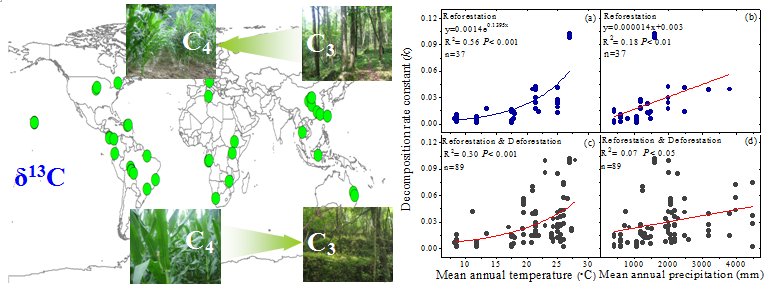 毁林或森林恢复引起的C3植被和C4植被之间的转换会导致土壤有机碳稳定同位素信号的改变,因而这类生态系统为探讨土壤有机碳动态沿气候梯度的变化提供了独特的材料。中科院武汉植物园系统生态学课题组的研究人员利用秦岭地区由C4植被转为C3植被的弃耕地,以及全球其它地区发生了C3和C4植被转换的生态系统,通过稳定同位素分析,首次揭示了土地利用变化后土壤有机碳动态与气候因子的关联性。研究发现,土壤有机碳的分解速率随年均温、年均降水量的升高而上升,土壤有机碳的分解速率与年均温存在指数关系。这一结果推翻了Giardina和Ryan的研究结论,提示全球变暖会导致土壤有机碳分解的加快。研究人员指出Giardina和Ryan的研究产生偏差的主要原因是未考虑土壤采样深度和土地利用变化类型。此外,研究人员还建立了土地利用变化后“新碳”(来源于新植被)与“旧碳”(土地利用变化前原有碳)比例变化的经验方程,并基于经验方程,估算出毁林和森林恢复后土壤有机碳来源发生转换的时间分别为43.4年和45.4年。