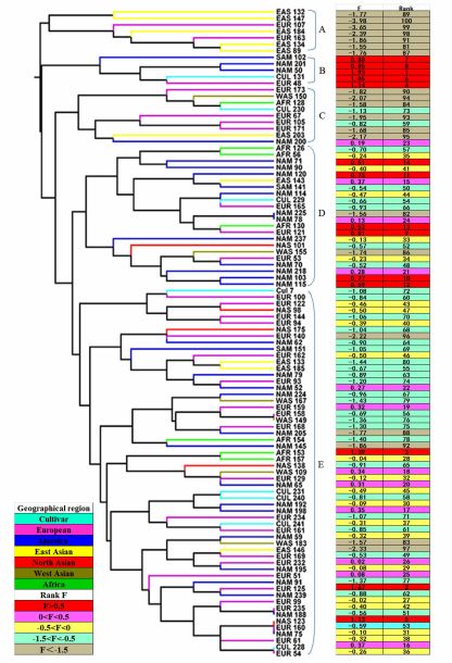 孙小艳博士在傅金民研究员的指导下,以课题组收集的来源于不同生境的100份高羊茅种质为试验材料,进行温室和培养箱两轮高温,构建耐高温功能性状数据库,结果表明100份高羊茅种质耐热功能性状呈现很高的多样性,其中相对生长速率PRGR在栽培种质群体中的变异系数达64.22% P<0.001),而在非洲、亚洲和美洲野生群体中的变异系数均高于50%P<0.05)。相对蒸腾速率PRET在亚洲、欧洲和非洲群体中也呈现较高的多样性,其变异系数均高于46.19%。通过因子分析(FA)和主成份分析(PCA)构建了2个回归数学模型F=0.54×F1+0.28×F2+0.18×F3(培养箱试验)和F=0.65×F1+0.35×F2(温室试验),并鉴定出耐热高羊茅种质5份。利用SSR分析标记技术对其进行遗传多样性分析,结果表明相对于其它群体,非洲群体呈现最高的遗传多样性,其中Nei’s gene diversity 0.2640) PIC 0.2112。本研究还对高羊茅遗传关系和其耐热性进行相关分析,发现耐热能力接近的材料其遗传关系也较近。