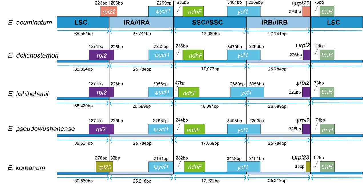淫羊藿物种间叶绿体基因组LSC,SSC以及IR区边界位置比较