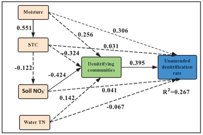 中国科学院水生植物与流域生态重点实验室湿地生态学学科组的马琳、刘贵华和刘文治等科研人员在青藏高原选取了36个河流、湖泊和沼泽湿地,测定了土壤硝化、反硝化、甲烷产生和氧化等氮碳生物地球化学过程的速率,分析了植物和功能微生物的群落结构。结果发现,氮碳生物地球化学过程的速率在不同类型湿地间没有显著性差异。含水量、氮碳含量等土壤理化性质能够解释过程速率大部分的变异,而微生物多样性和丰度在调控反硝化过程速率中起重要作用。路径分析进一步发现土壤理化性质能够直接或通过影响微生物群落来间接调控氮碳生物地球化学过程 (1)。该工作揭示了在高海拔偏远的青藏高原湿地,许多关键的氮碳生物地球化学过程是由土壤环境因素和功能微生物共同调控的。该工作还发现,青藏高原湿地的氮碳生物地球化学过程普遍存在氮限制,暗示废水排放和氮沉降等人类活动可能会显著改变氮碳生物地球化学过程,并进而影响青藏高原湿地的生态功能。