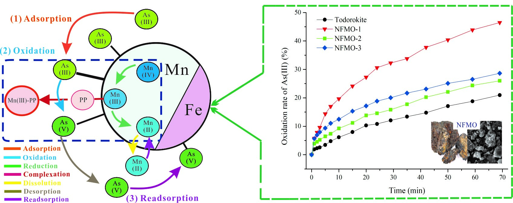 砷 (As) 是一种常见的准金属元素,由于其高毒性和致癌性而备受关注。在自然环境中,砷主要以亚砷酸盐和砷酸盐这种无机形式存在。相比于As(V),As(III)具有更大的毒性。自然环境中,Fe-Mn二元氧化物广泛存在,由于其廉价,对环境无害,且对As(III)具有较高的去除能力,而引起了人们越来越多的关注。尽管许多研究已经探讨了合成铁锰二元氧化物对As(III)的去除效果和作用机制,但是针对天然铁锰矿物对As(III) 氧化和吸附表面化学机制尚不明确。
