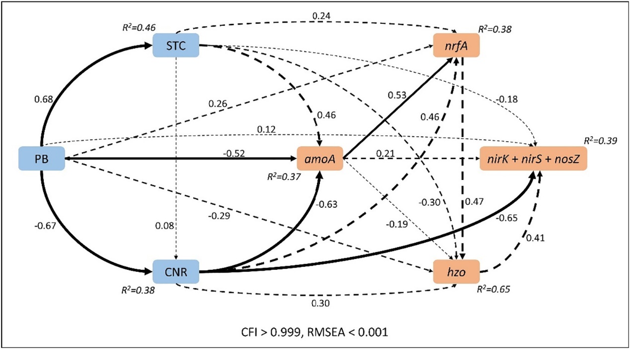 武汉植物园湿地生态学学科组针对洪湖西南、东北湖区不同沉水植被情势,调查沉积物氮循环细菌如硝化、反硝化、厌氧氨氧化(anammox)和硝酸盐异化还原成铵(DNRA)细菌群落组成、多样性和丰度对不同沉水植被物种丰富度和生物量的响应结果,以及相关环境因子如水质和沉积物性质的响应趋势。研究结果表明,洪湖沉水植被的生物量和物种丰富度既可直接影响沉积物氮循环细菌群落的组成、多样性和丰度,亦可通过改善湖泊水质和沉积物性质而间接地作用于氮循环细菌群落。随着沉水植被生物量和物种丰富度的增加,大多数氮循环细菌群落包括硝化、反硝化和DNRA细菌的多样性减少,丰度增加,而anammox细菌则呈相反趋势。同时,研究结果发现沉积物高碳氮比(C:N)对硝化和反硝化细菌的群落丰度具有显著负效应,从而为高碳氮比促进微生物脱氮效应的传统认知做出新注解。此外,结构方程模型的分析结果显示,在沉水植被的驱动下氮循环细菌形成了积极的种间相互作用。总的来讲,浅水湖泊中沉水植被生长越好,沉积物脱氮效率就越高。