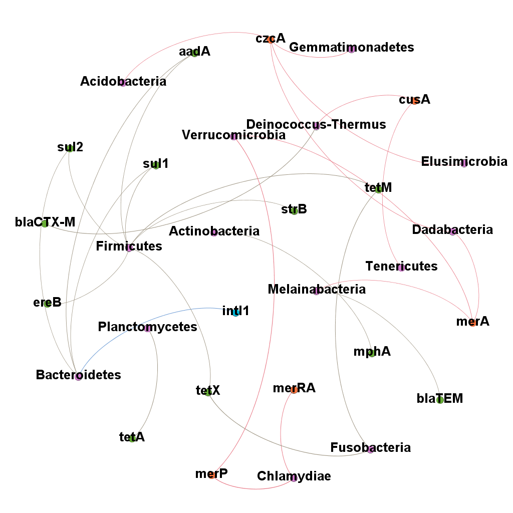 中国科学院水生植物与流域生态重点实验室环境基因组学学科组的张卫红等科研人员在杨玉义研究员指导下,通过相关性分析调查了水环境中耐药基因与细菌之间的相关关系。研究结果发现 aadA、tetM、mphA和tetA 是水环境中主要的耐药基因。厚壁菌门(Firmicutes)可能是耐药基因的主要潜在宿主。此外一些耐药性抗性基因在不同细菌之间可能会通过遗传元件(MGEs)进行传递或交换。