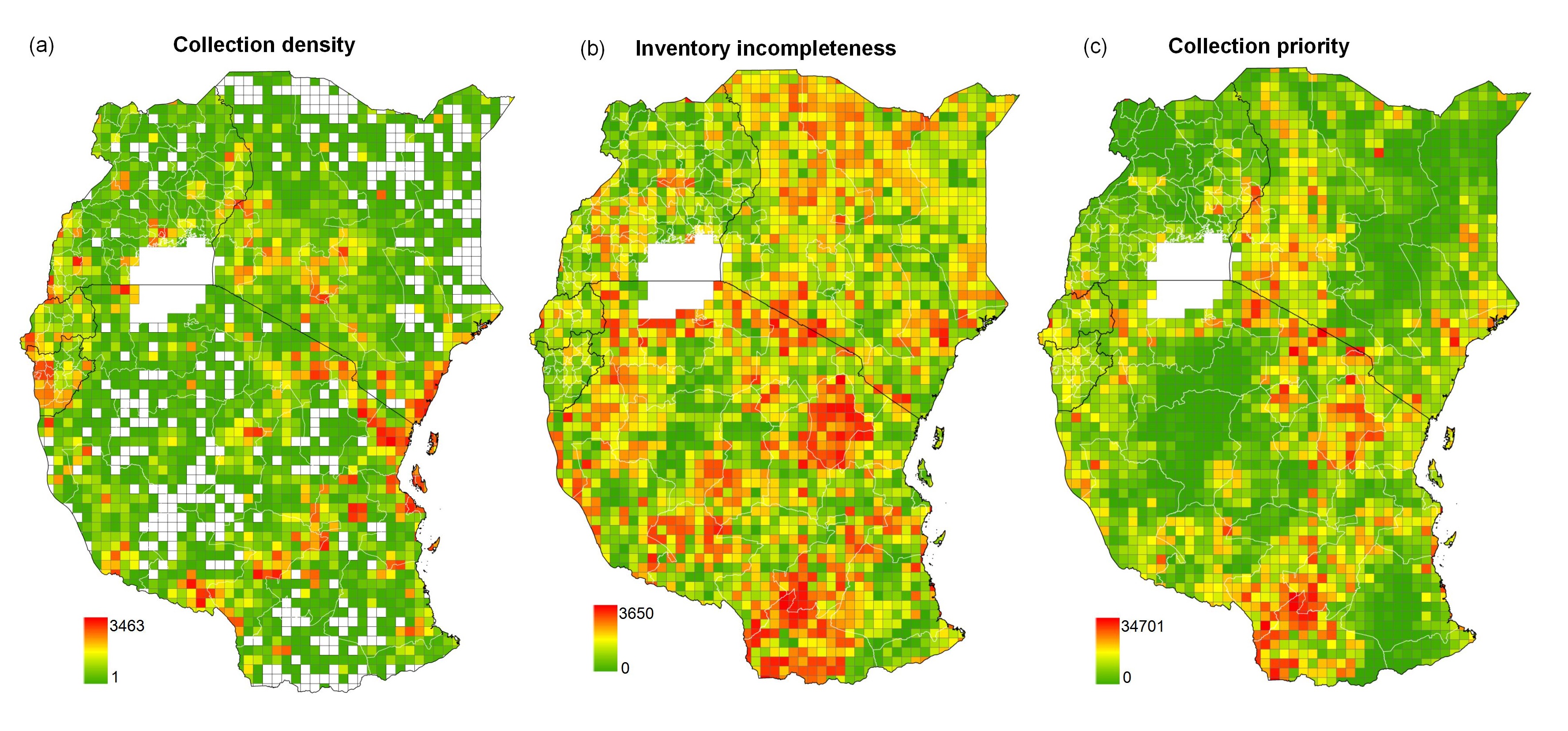 热带东非标本采集密度(a),采集不完整性(b)以及采集优先区域(c)