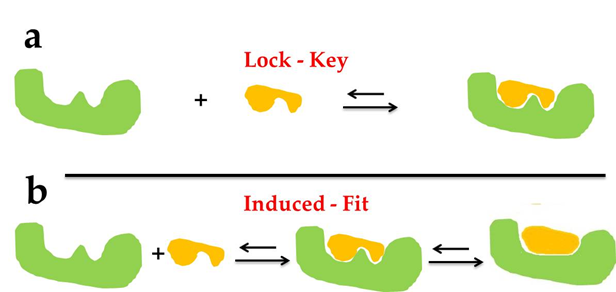 图1. 分子对接类型:a 锁-钥匙模型;b诱导-拟合理论。