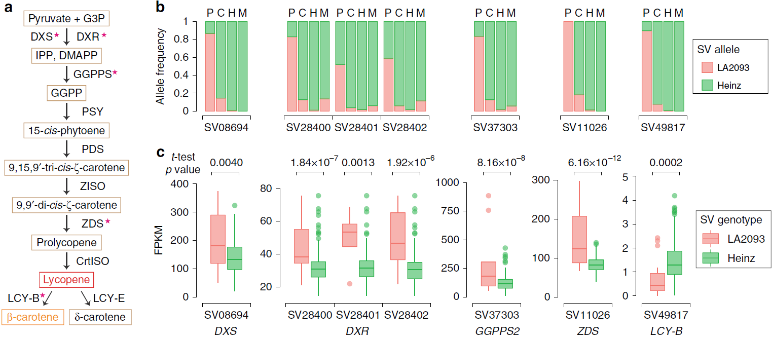 图2 受选结构变异及其对番茄红素累积相关基因表达的影响