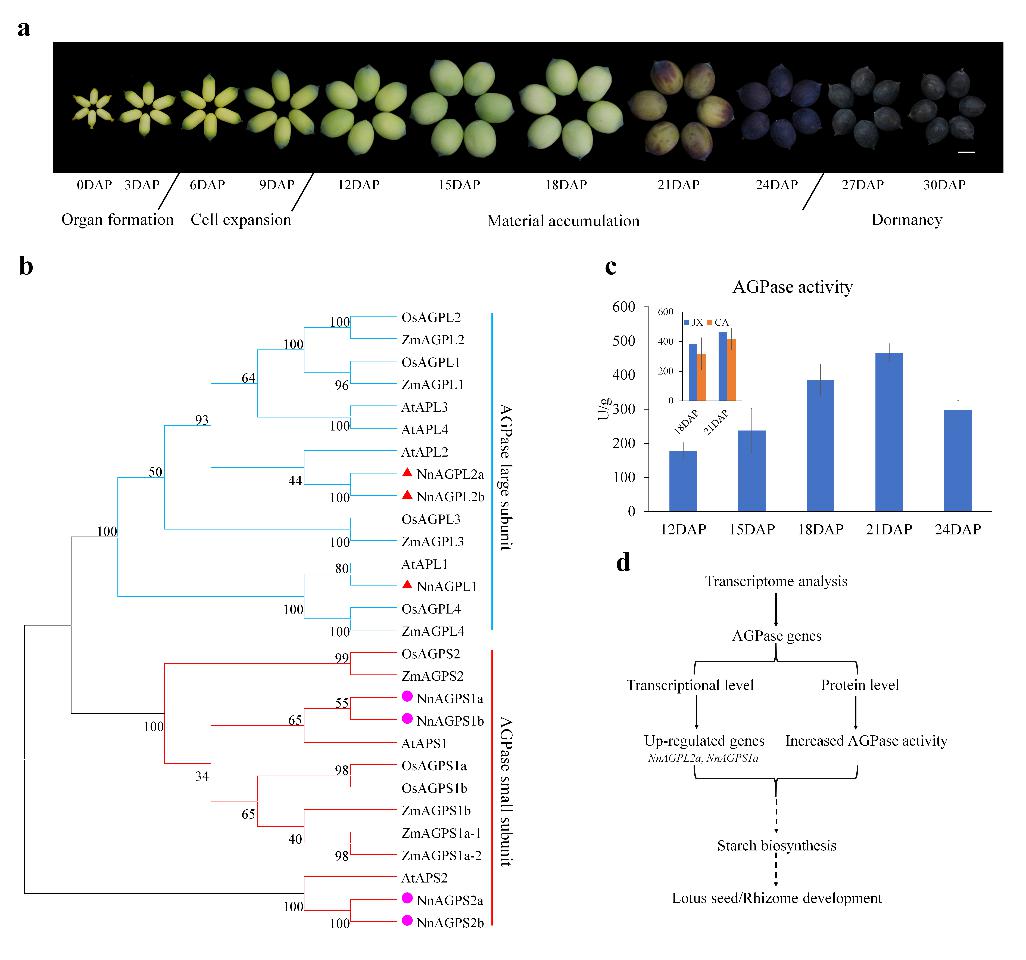 进展一:研究者分别对30个子莲栽培种的莲子营养成分进行分析,发现授粉后15天(15DAP)的青鲜莲子和成熟莲子中的淀粉平均含量分别为28.20%和47.12%。通过莲子比较转录组分析,揭示淀粉和蔗糖代谢途径参与莲子发育进程,多个参与淀粉合成途径的酶编码基因在9DAP - 12DAP发育进程中诱导上调表达,包括ADP葡萄糖焦磷酸化酶(AGPase)。结合莲前期已公布基因组数据,分别鉴定到3个和4个基因编码AGPase大亚基和小亚基,且进化分析表明大小亚基分化明确。通过表达分析发现NnAGPL2a和NnAGPS1a为参与莲子发育优势表达基因,其与多个参与淀粉和蔗糖代谢途径基因存在共表达关系。此外,研究者发现NnAGPL2a和NnAGPS1a基因的表达模式AGPase酶活性变化和莲子中淀粉含量的积累三者之间的变化模式趋于一致。以上研究结果拓展了对莲子淀粉合成的分子机制的认识,为高淀粉子莲新品种的改良和选育提供理论依据。该研究成果以“Comprehensive analysis of AGPase genes uncovers their potential roles in starch biosynthesis in lotus seed” 为题,发表于国际学术期刊BMC Plant Biology。武汉植物园莲种质资源与遗传育种学科组助理研究员孙恒和湖北工程学院李娟娟为论文共同第一作者,杨美研究员为论文通讯作者。本研究得到国家自然科学基金、中国科学院前沿科学重点研究项目和中国科学院青年创新促进会项目的资助。