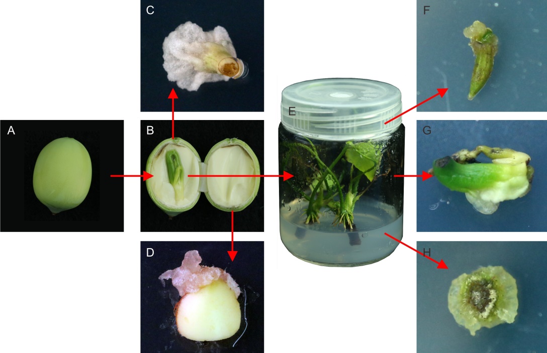 进展二:研究者通过优化一系列影响愈伤组织形成的关键因素,开发了一套高效的荷花愈伤组织诱导系统。研究发现在含有3 mg/L 2,4-D和0.5 mg/L 6-BA的MS培养基中,以未成熟莲子子叶和胚作为外植体诱导出的愈伤组织效率最高。此外,莲的基因型、光照条件、外植体发育阶段和取样时间对诱导愈伤组织也有一定的影响。以‘十里荷1号’授粉后9天的莲子子叶为外植体,在弱光条件下培养,被认为是莲愈伤组织诱导的最佳条件。利用未成熟种子的莲心培育出的无菌苗,也是诱导优质愈伤组织的优良外植体。此外,研究者在莲的愈伤组织中发现了莲生物碱的累积和生物碱合成相关基因的表达。以上研究结果为建立莲体细胞胚胎发生转化体系提供了重要的理论指导,同时对建立利用体细胞培养技术生产生物碱体系方面具有重要的价值。该研究成果以“The Establishment of an Efficient Callus Induction System for Lotus (Nelumbo nucifera)”为题,发表在国际学术期刊Plants。武汉植物园莲种质资源与遗传育种学科组副研究员邓显豹和硕士研究生熊雅倩为论文共同第一作者,杨美研究员为论文通讯作者。本研究得到国家自然科学基金、中国科学院前沿科学重点研究项目、中国科学院青年创新促进会项目和中央高校基本科研业务费专项资金的资助。