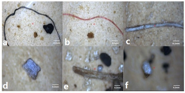 图1.立体显微镜下微塑料观察到的微塑料:纤维(a, b, c), 碎片(d), 微珠(e)和泡沫(f)