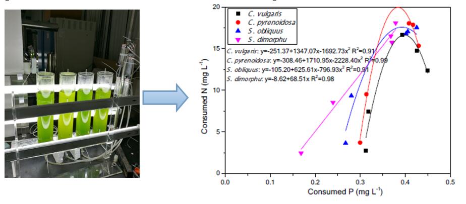 1 四种微藻在光反应器中生长及其对尾水中氮磷的消耗比