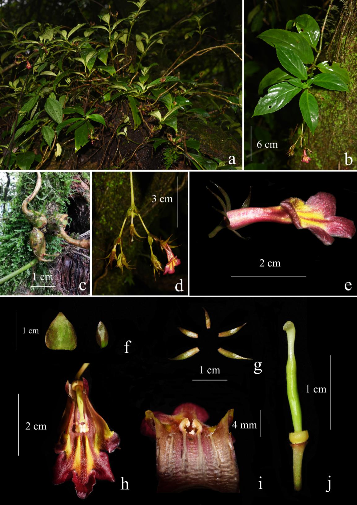 猩红吊石苣苔(Lysionotus coccinus)(图1)与深紫吊石苣苔(L. atropurpureus)最为相似,但新种根状茎椭圆形3.5–4.5 × 2.3–2.5 cm,叶边缘波状齿,聚伞花序具6–15朵花,花冠猩红色,苞片三角卵形5–10 × 4–8 mm,花萼长10–12 mm,花冠长约1.5cm,易于与之区分。文章连接https://doi.org/10.1111/njb.02912
