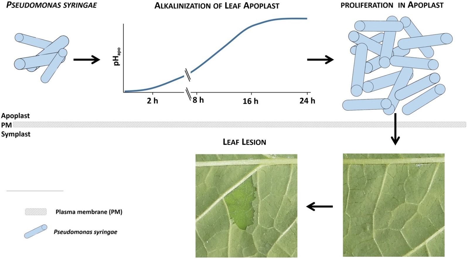 质外体是植物感受和适应环境生物和非生物胁迫的前沿区域。质外体瞬态碱化作为一种重要的根-茎信号在植物体内进行胁迫信息传导,对于植物应对和适应环境胁迫,如营养缺乏、水分不足、洪涝、病虫害等有重要意义。然而目前有关植物质外体pH调节和应对环境胁迫(如细菌病害)的作用机制还不清晰。