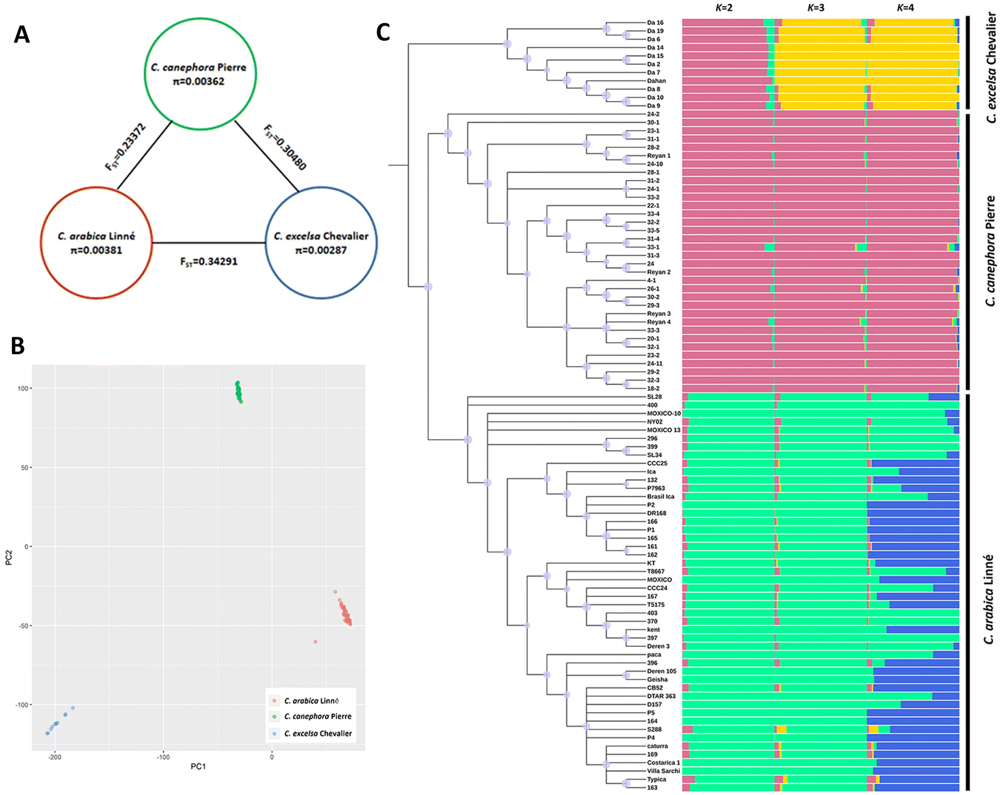 图1. 咖啡小粒种(Coffea arabica)、中粒种(C. canephora)以及埃塞尔萨种(C. excelsa)的种群遗传分化
