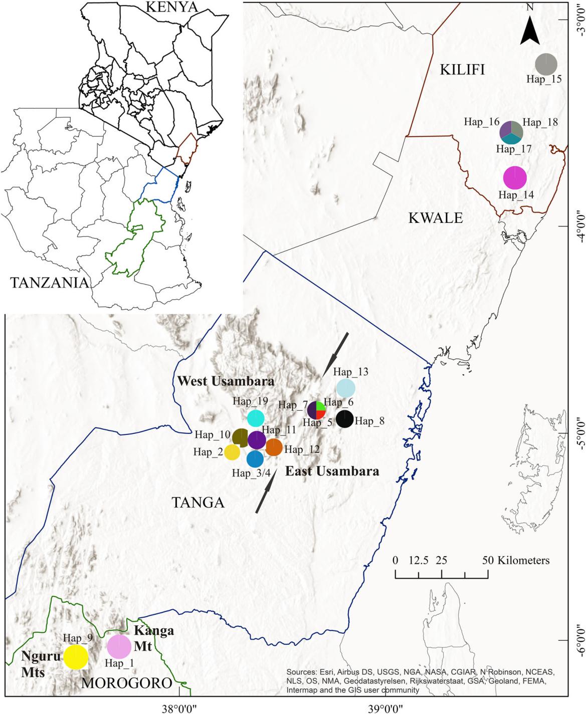 Streptocarpus ionanthus复合体中已界定的9个亚种,其中1个分布于肯尼亚沿海,而另外8个分布于坦桑尼亚。坦桑尼亚的乌萨姆巴拉山为该复合体的分布热点区域,坦桑尼亚分布的8个亚种在此处均有分布。武汉植物园的研究人员,利用核微卫星和叶绿体微卫星序列对Str. ionanthus开展了群体遗传学和谱系地理学研究。研究人员估算了叶绿体DNA单倍型的分化时间,并对Str. ionanthus历史上的、现在的和未来的分布模式进行了建模。该研究共收集了7个亚种的21个居群,采样覆盖了Str. ionanthus的整个分布区范围,与之关联物种Str. nitidus和Str. brevipilosus在本研究中采集了两个居群为代表。