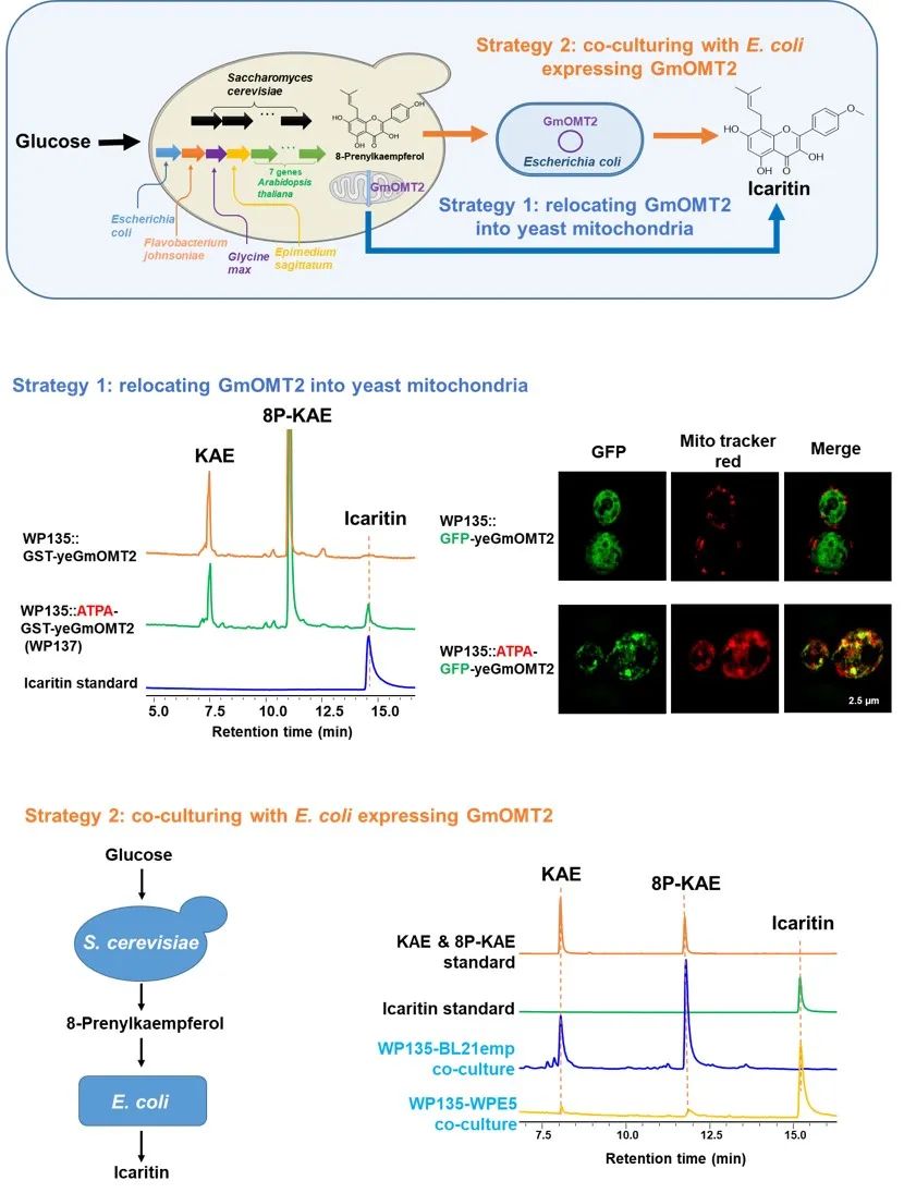 本研究从箭叶淫羊藿中挖掘与鉴定了一个异戊烯基转移酶EsPT2,其高效催化黄酮类化合物山奈酚(KAE)的C8异戊烯基化形成8-异戊烯基山奈酚(8P-KAE);利用从大豆中催化8P-KAE的C4’-OH甲基化的甲基转移酶GmOMT2,首次成功搭建了淫羊藿素的人工生物合成途径。通过引入11个外源基因以及改造12个酵母内源基因,构建了高产8P-KAE的酵母底盘。由于在弱酸性条件下GmOMT2的活性受到强烈抑制,导致其在8P-KAE酵母底盘细胞质中表达失去活性。我们通过采取将GmOMT2定位于弱碱性(pH7.2-7.5)的线粒体中进行表达,或将8P-KAE酵母底盘与表达GmOMT2大肠杆菌共培养的策略,成功实现了淫羊藿素的生物合成,其产量分别为7.2和19.7 mg/L。该研究首次搭建了晚期肝癌候选药物淫羊藿素的人工生物合成途径,并通过创建微生物细胞工厂,不仅实现了以葡萄糖为碳源从头合成淫羊藿素,同时也为解决合成生物学研究可能面临的生物元件pH不适配的问题提供了可借鉴的新策略。