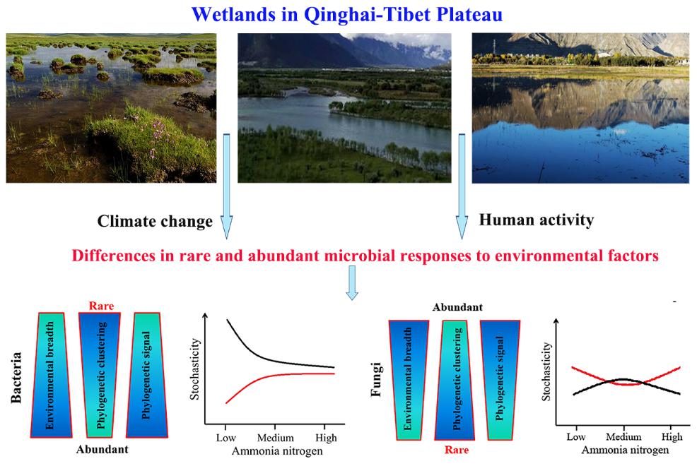 中国科学院水生植物与流域生态重点实验室、武汉植物园环境基因组学学科组万文结副研究员与杨玉义研究员、湿地生态学科组刘文治研究员,同英国邓迪大学Geoffrey Michael Gadd教授和香港大学顾继东教授开展合作,以青藏高原湿地为研究对象,测定了土壤里细菌和真菌多样性以及土壤的理化性质;使用多种统计学分析方法,从稀有和丰富种的角度分析了细菌和真菌对环境响应的阈值和系统发育信号。研究结果表明:丰富的细菌和真菌较相应的稀有的细菌和真菌具有更强的环境适应性,稀有的细菌和真菌较相应的丰富的细菌和真菌具有更紧密的系统发育聚集。稀有和丰富的细菌和真菌的群落构建受土壤铵态氮含量的影响。该研究为湿地生态系统里微生物多样性的维持机制提供了新的见解和分析手段,为湿地生态系统的环境保护丰富了理论基础。