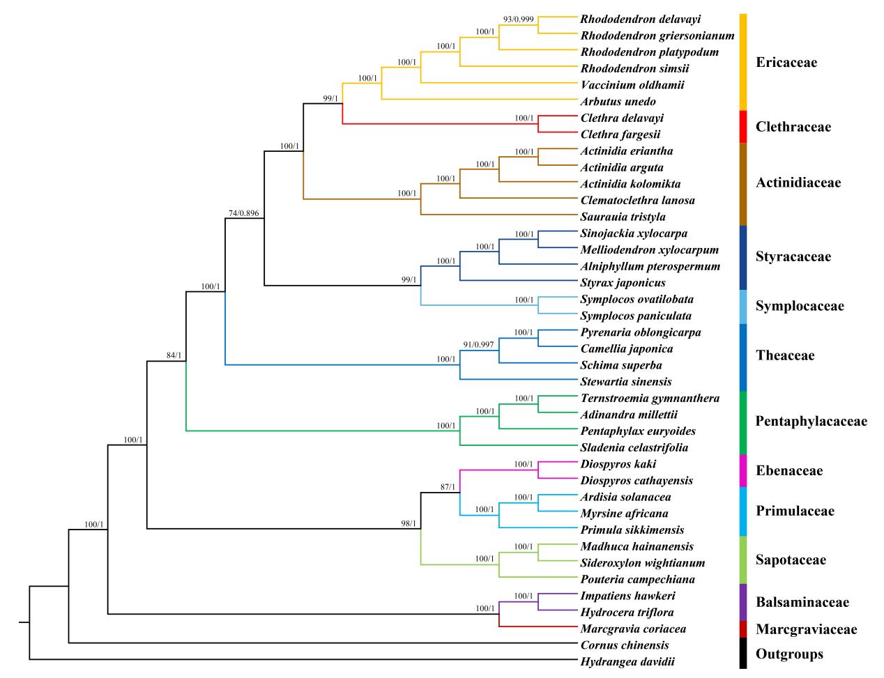 图2. 基于40个杜鹃花目植物的75个叶绿体蛋白质编码序列串联数据构建的最大似然法和贝叶斯法系统发育树