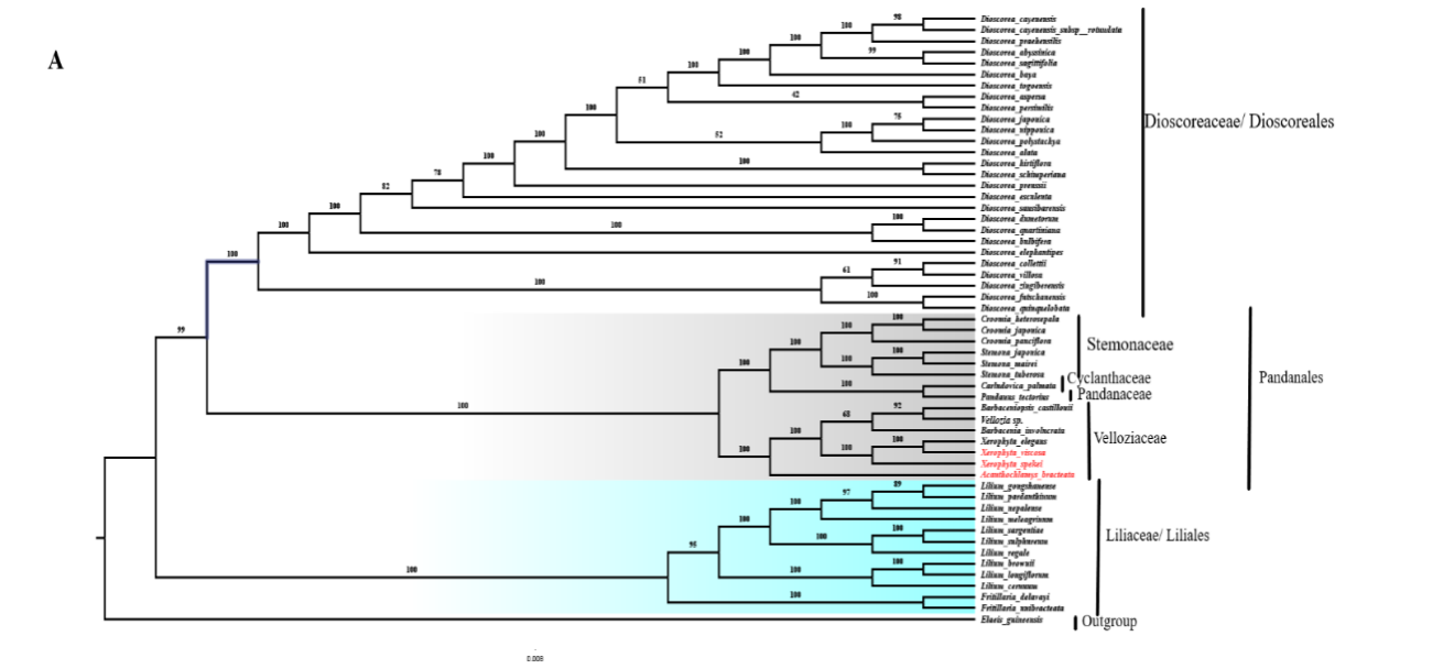 中国科学院武汉植物园东非植物区系与分类学科组对采自我国横断山区的芒苞草的叶绿体全基因组进行了分析,并与两个产自非洲的黑炭木属植物Xerophyta spekeiX. viscosa进行了叶绿体全基因组序列和形态上的比较研究。研究结果显示,芒苞草和黑炭木属的Xerophyta spekeiX. viscosa的叶绿体基因组全长分别为153,843 bp155,235 bp155,498 bp。叶绿体基因组由反向重复区(IRS)(IRaIRb)、大单拷贝区(LSC)及小单拷贝(SSC)区组成,上述三个物种的反向重复区序列长度在27,022 bp27,110 bp之间,大单拷贝区(LSC)长度在81,919 bp83,813 bp之间,小单拷贝(SSC)区长度在17,387 bp17,880 bp之间。利用叶绿体基因组数据进行的系统发育分析表明,芒苞草是翡若翠科其余物种的姊妹群,是该科较早分化出来的物种(图1)。分析结果强烈支持芒苞草与非洲翡若翠科的类群聚为一支,表明芒苞草与翡若翠科其他类群的近缘关系。