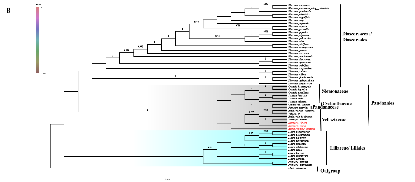 研究成果以 “Complete Chloroplast Genomes of Acanthochlamys bracteata (China) and Xerophyta (Africa) (Velloziaceae): Comparative Genomics and Phylogenomic Placement 为题,发表在国际植物学期刊Frontiers in Plant Science, 本项工作得到了中国科学院国际合作计划项目(151853KYSB20190027)、中国科学院中-非联合研究中心项目(SAJC202101)和中国科学院大学博士生奖学金项目ANSO青年人才奖学金的资助。