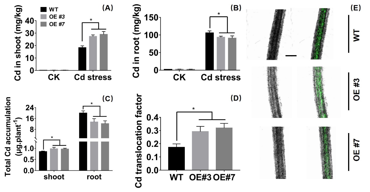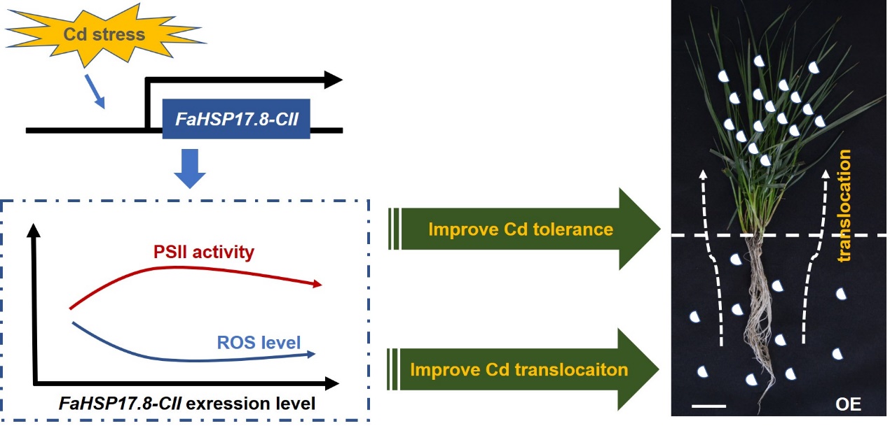 该研究发现,在高羊茅中超表达FaHSP17.8-CII基因,极大缓解了镉对植株叶片和叶绿体结构,以及叶绿素的毒害作用,降低了ROS富集水平,增强了PSII活性。ROS富集水平下降以及PSII活性增强,直接导致了植株镉修复能力的改变。进一步研究表明,在高羊茅中超表达FaHSP17.8-CII基因,植株地上部鲜重增加了30-40%。FaHSP17.8-CII-OE遗传材料中,镉地下部向地上部转移因子(TF)增加了69%-85%,而其地上部镉富集能力增加了49-59%。
