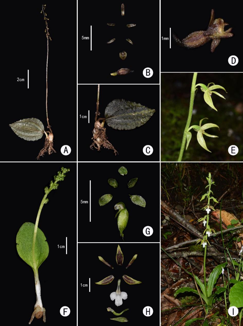 图2. 四川省的新记录兰科植物:软叶筒距兰(A~D)、戟形虾脊兰(E、H 、I)和兜蕊兰(F、G)。(照片拍摄:A-D.王俊杰;F-G.彭帅;E, H-I.杨家鑫)