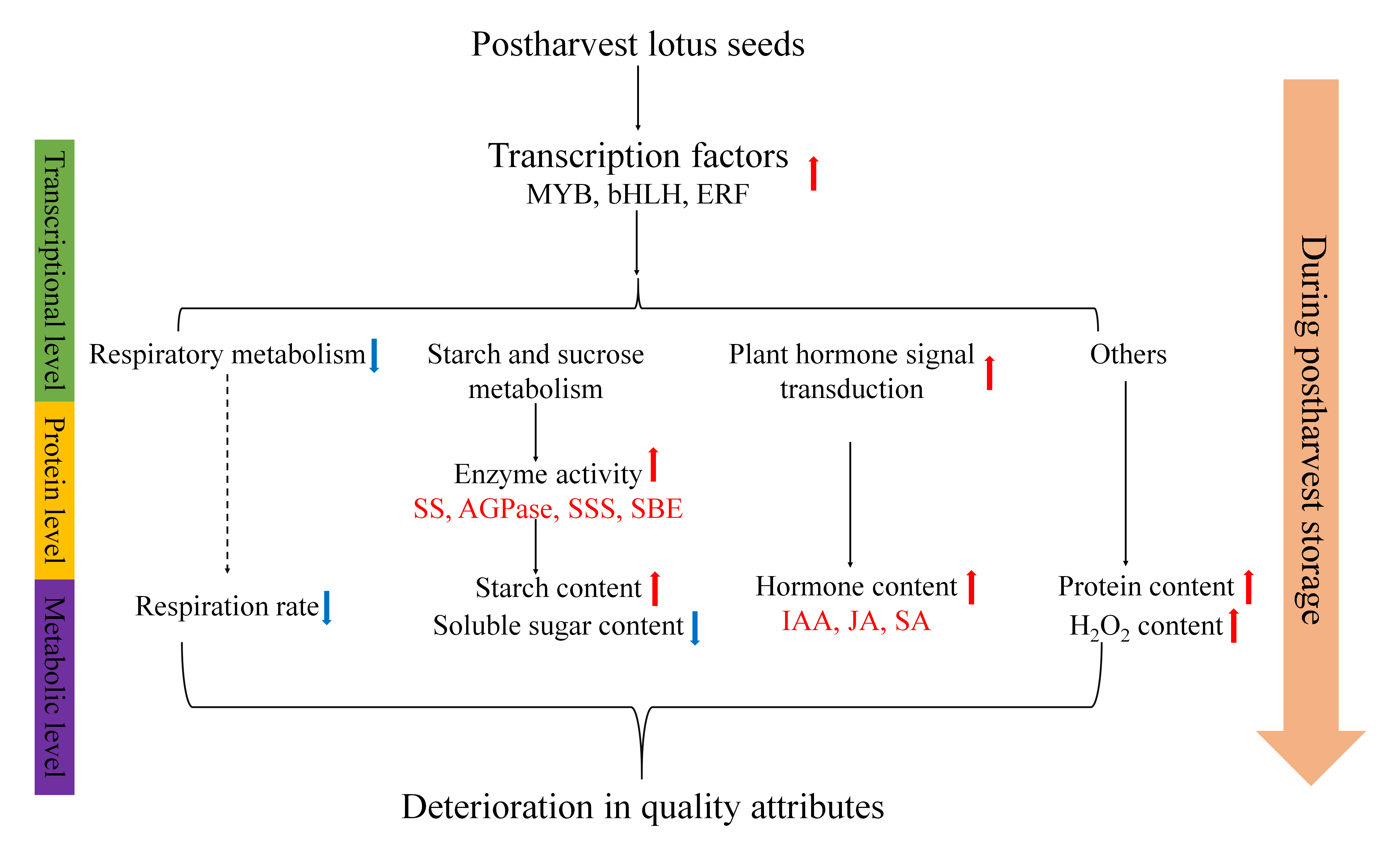 研究表明,鲜莲子在采后贮藏过程中可溶性糖含量持续性下降,淀粉和蛋白质含量增加,导致莲子硬度增加,甜度降低。转录组分析鉴定到3148个基因差异表达,这些基因参与多种生物学途径。淀粉和蔗糖代谢途径的基因呈现出复杂的表达模式,一些参与淀粉合成的酶的活性增加,例如ADP葡萄糖焦磷酸化酶(AGPase)和可溶性淀粉合成酶(SSS)等。多数参与糖酵解和三羧酸循环的基因下调表达。此外,莲子采后贮藏期间植物激素生长素(IAA)、茉莉酸-异亮氨酸(JA-Ile)和水杨酸(SA)含量增加,同时参与其信号转导途径相关基因差异表达。