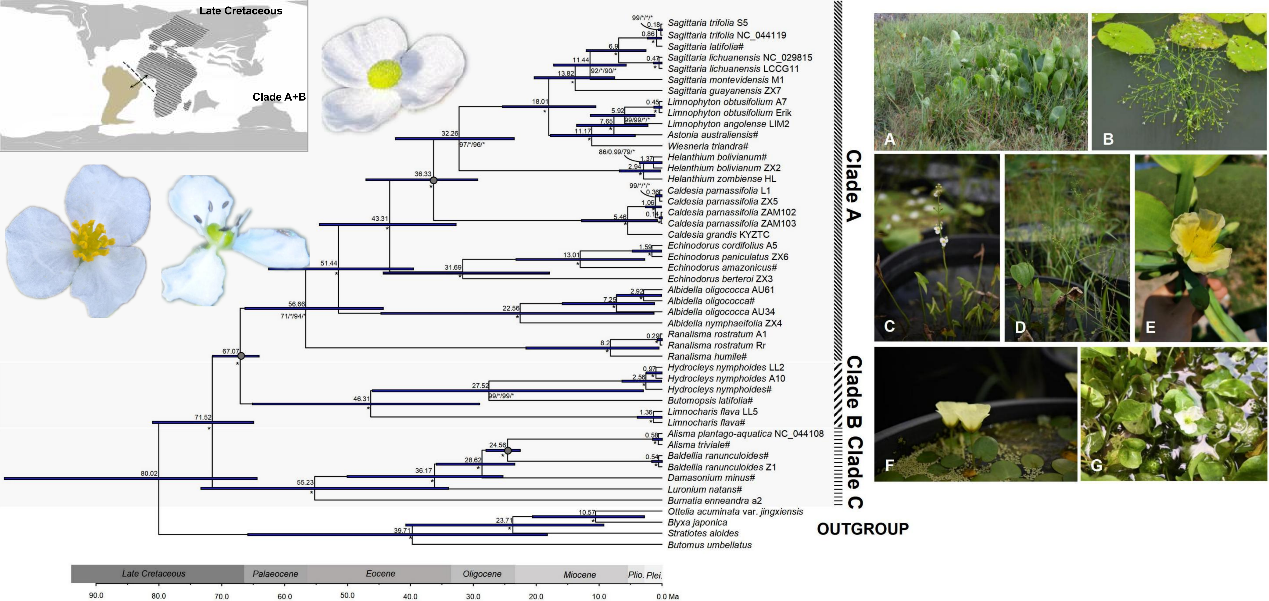中国科学院武汉植物园水生植物研究中心陈进明课题组联合芬兰和巴西等有关科研人员对泽泻科植物进行了广泛取样,获得了该科所有属及大部分物种的材料。研究人员利用78个质体基因完成了泽泻科完整属级质体系统发育基因组学分析,并重新分析了该科的生物地理历史,研究结果显示泽泻科内存在三大高支持率的分支;该研究针对前人研究中系统位置一直存在争议的Helanthium,泽苔草属(Caldesia),Albidella,毛茛泽泻属(Ranalisma),Burnatia等属进行了全面深入的系统发育分析,明确了非洲单属种Burnatia应与第三分支其他温带属互为姐妹群,支持将原泽苔草属的Caldesia oligococca等物种移至Albidella属中。基于该研究所得到的可靠的系统发育框架,研究人员对泽泻科的生物地理历史进行了重新评估,发现该科可能起源于白垩纪的新热带、西古北区及旧热带地区,随后由于地理隔离和扩散事件分为三大主要分支与之前研究结果不同,研究人员推测主要的温带分支很可能于始新世时期起源于西古北区及旧热带地区,其他两大分支的共同祖先位于白垩纪晚期的新热带地区,认为长距离扩散和地理隔离很可能共同促进了该科植物现今跨洋分布模式。
