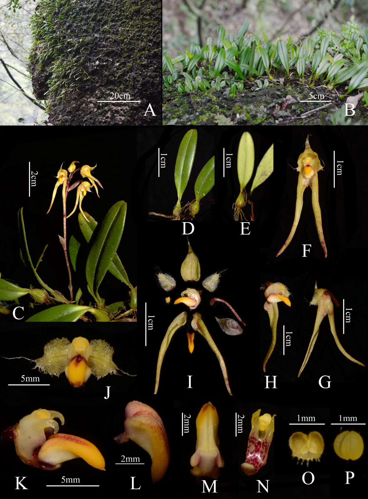 A.生境,B.群落,C.植株,D.叶正面,E.叶反面,F.花正面,G.花背面,H.侧萼片、花瓣、唇瓣、合蕊柱,I.花离析,J.花瓣、唇瓣、合蕊柱,K.唇瓣、合蕊柱,L.唇瓣侧面,M.唇瓣背面观,N.合蕊柱,O.药帽,P.花粉团。