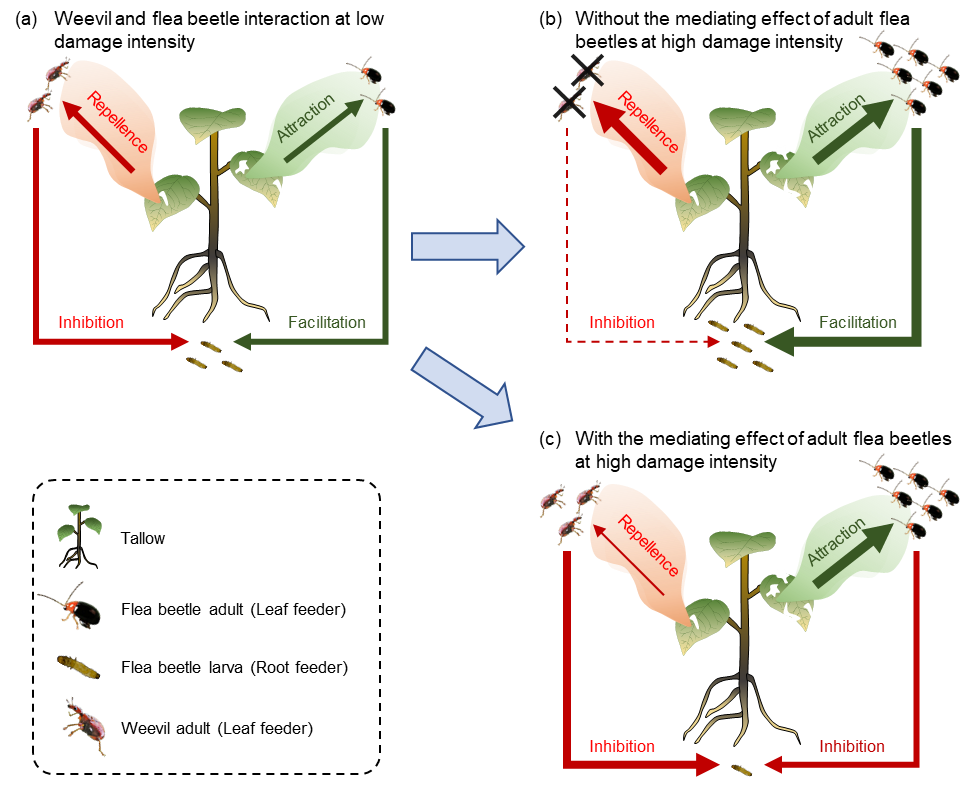图:以乌桕 (Triadica sebifera)和两种专食性昆虫——红胸律点跳甲(Bikasha collaris)和乌桕卷象(Heterapoderopsis bicallosicollis)为例,描述昆虫物种特异性和密度依赖效应如何影响植物诱导反应及其生态后果。(a)当地上昆虫取食伤害程度较低时,跳甲地上成虫和地下幼虫可以通过增加有益挥发物的释放或改善根部营养状况来相互促进;而卷象成虫和跳甲幼虫则通过增加有害挥发物的释放或削减根部营养状况来相互抑制。(b)如果跳甲成虫对其幼虫没有密度依赖的调节作用(低密度促进,高密度抑制),跳甲地上成虫密度的升高将会促进地下幼虫的存活,而这将进一步削减地上卷象的密度甚至将其在该研究体系中排除。(c)反之,如果跳甲成虫对其幼虫具有密度依赖的调节作用,过高的地上成虫密度将会抑制地下幼虫的存活,而这将削减对卷象成虫的抑制作用并将其始终维持在乌桕体系中。图中红线表示抑制作用,而绿线表示促进作用。