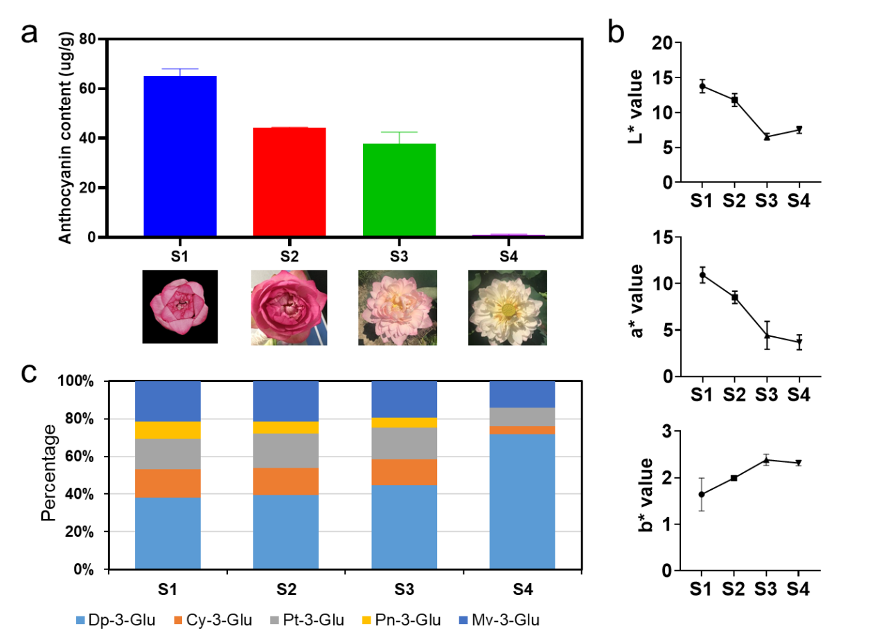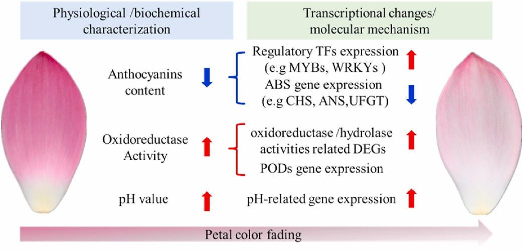 莲,中国十大传统名花之一,具有很高的观赏价值。莲花的颜色是决定莲观赏品质的重要性状,然而莲花的花期短,开后花色变淡,直接影响其观赏质量。为了探究莲花色衰退的机制,提高莲的观赏性,中国科学院武汉植物园的莲种质资源与遗传育种学科组开展了莲花色衰退的机理研究,研究成果以“Color fading in lotus (Nelumbo nucifera) petals is manipulated both by anthocyanin biosynthesis reduction and active degradation”为题发表于国际期刊Plant Physiology and Biochemistry。