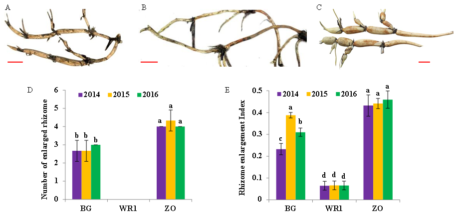 莲是我国重要水生经济作物,集观赏、食用和药用价值于一身。莲的地下茎(发育早期为不膨大的藕带,发育后期膨大成藕)不仅是一种重要的水生蔬菜,而且是进行无性繁殖的繁殖器官。热型莲的地下茎因不能膨大成藕,无法在亚热带地区和温带地区成功越冬,所以莲藕膨大可保证莲成功越冬和来年春季正常的发芽。