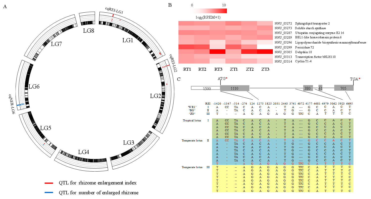 近日,Plant Molecular Biology发表了来自于武汉植物园的题为“Identification of QTLs and a putative candidate gene involved in rhizome enlargement of Asian lotus (Nelumbo nucifera)”的文章。该研究利用QTL定位和异源转化技术,开展了莲地下茎膨大机制的研究。该研究将热带莲和温带莲的F2分离群体进行了全基因组重测序技术,构建了一张含有236840个SNP的遗传连锁图,进一步对地下茎膨大节数和膨大系数等性状进行了QTL定位,获得了3个稳定性QTL。进一步对主效QTL区间内基因进行转录组的分析,发现了对地下茎膨大有促进作用的基因NnBEL6。该基因的表达量在地下茎膨大过程中诱导表达。通过异源转化马铃薯实验证实了NnBEL6对块茎膨大的作用。本研究揭示了莲藕膨大的遗传基础和候选基因,为增强莲越冬繁殖能力提供了理论依据。