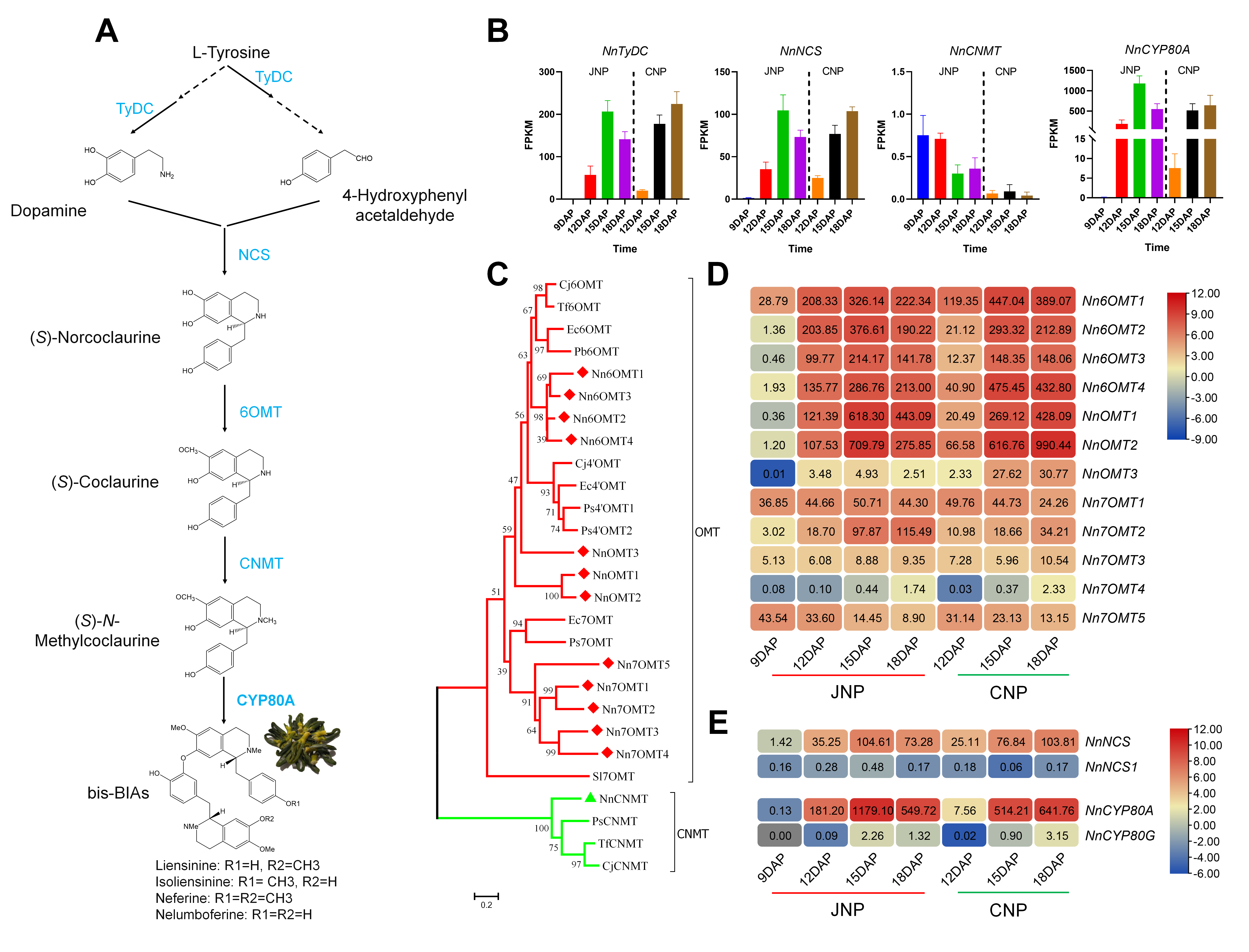 (A)预测的莲心生物碱合成步骤。(B)NnTyDC、NnNCS、NnCNMT和NnCYP80A基因的表达分析。(C)参与莲心生物碱合成的O-甲基转移酶(OMT)基因的系统发育树分析。(D)OMT基因的表达分析。(E)NnNCS 和 NnCYP80 同源基因间的差异表达。