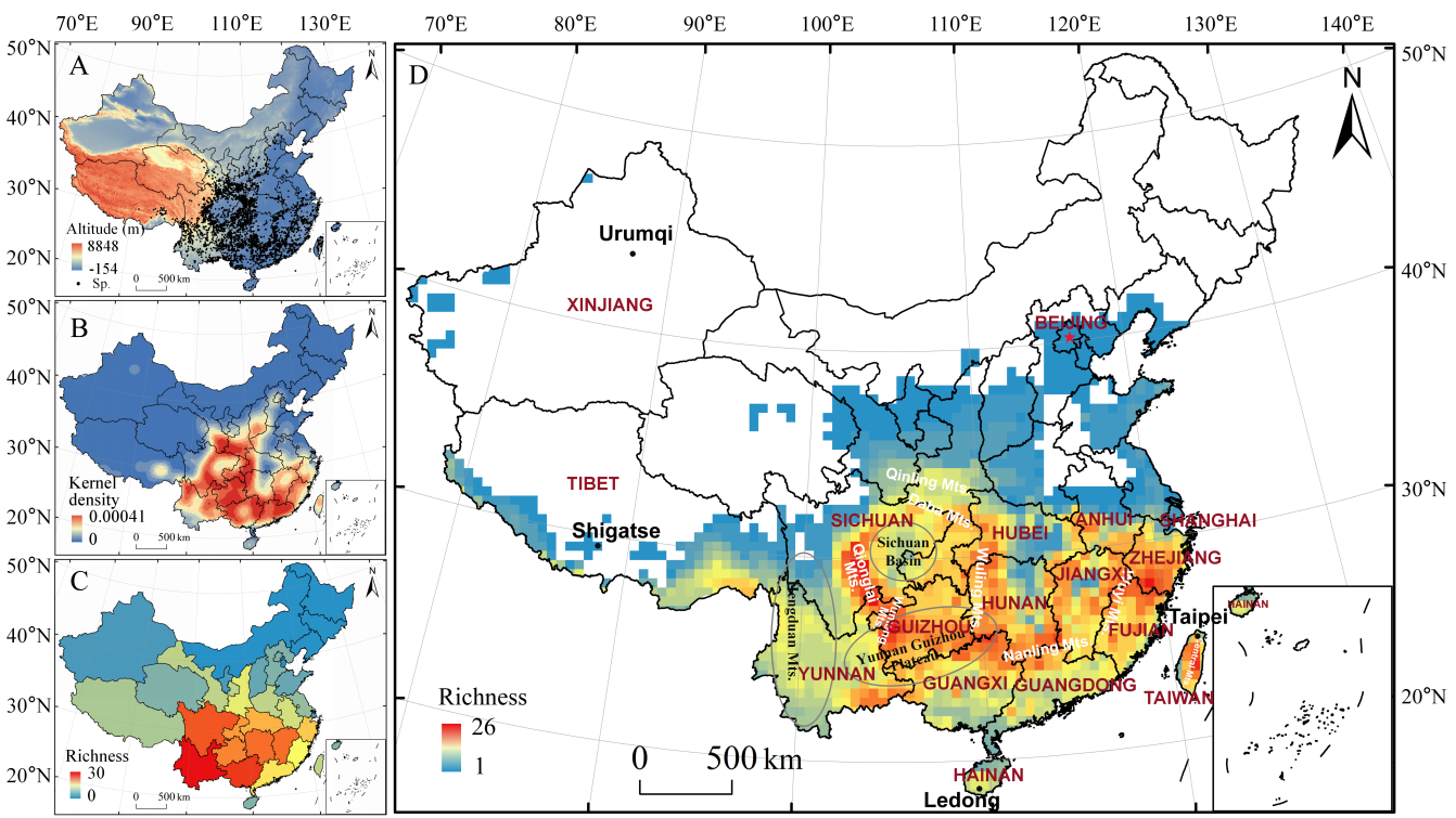 中国科学院武汉植物园国家荚蒾属种质资源库、武汉植物园生态景观与工程学科组研究人员基于标本记录及野外调查数据,确定了61个中国荚蒾属特有类群的分布信息,并利用物种分布模型MaxEnt研究了特有类群的分布格局及其影响因子。研究结果表明荚蒾属特有类群在中国的物种多样性热点地区主要分布在温带和亚热带山区,物种丰富度最高的区域在云贵高原和四川盆地附近的山地。荚蒾属特有类群中约三分之一为稀有类群,分布区域分散且缺乏保护。荚蒾属特有类群的物种丰富性空间格局可以用环境能量、水资源和气候季节性三个假说来解释。本研究对中国荚蒾属特有类群丰富度分布及其形成机制提供了新的认识和解释。同时,为荚蒾属特有类群的保护提供了措施,为中国荚蒾属特有类群的保护提供了指导。