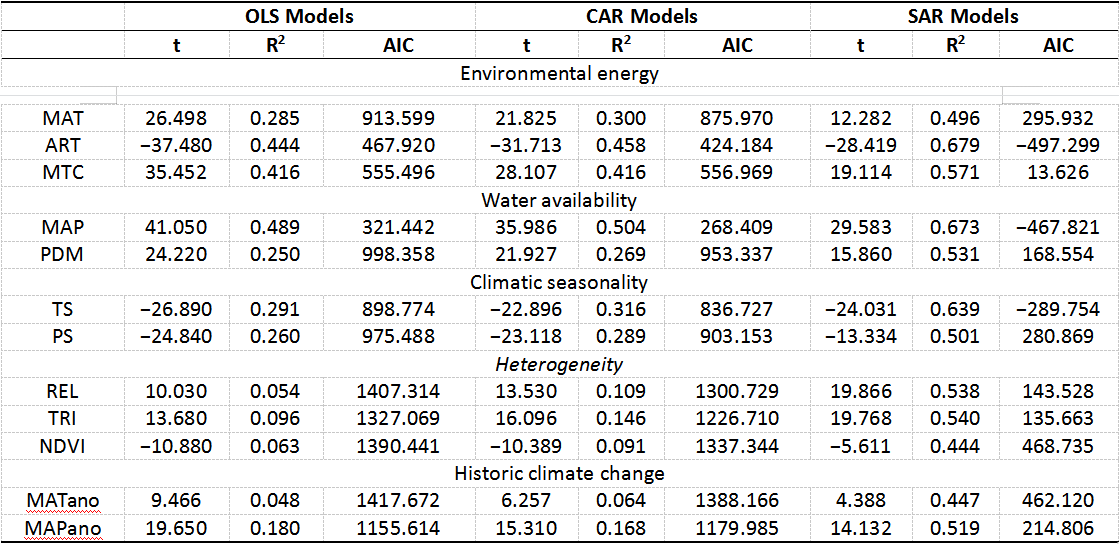 表1 利用简单普通最小二乘模型(OLS)、简单条件自回归模型(CAR)和同步自回归模型 (SAR)研究了中国荚蒾属特有类群丰富度与解释变量(MAT:年均温、ART:温度年较差、MTC:最冷地区平均温度、MAP:年均降水量、PDM:最干燥月份平均降水量、TS:温度季节性,PS:降水季节性、REL:每个栅格的高程范围、TRI:地形粗糙指数、NDVI:归一化植被指数、MATano:末次冰期以来的年均温、MAPano:末次冰期以来的年均降水量)之间的关系