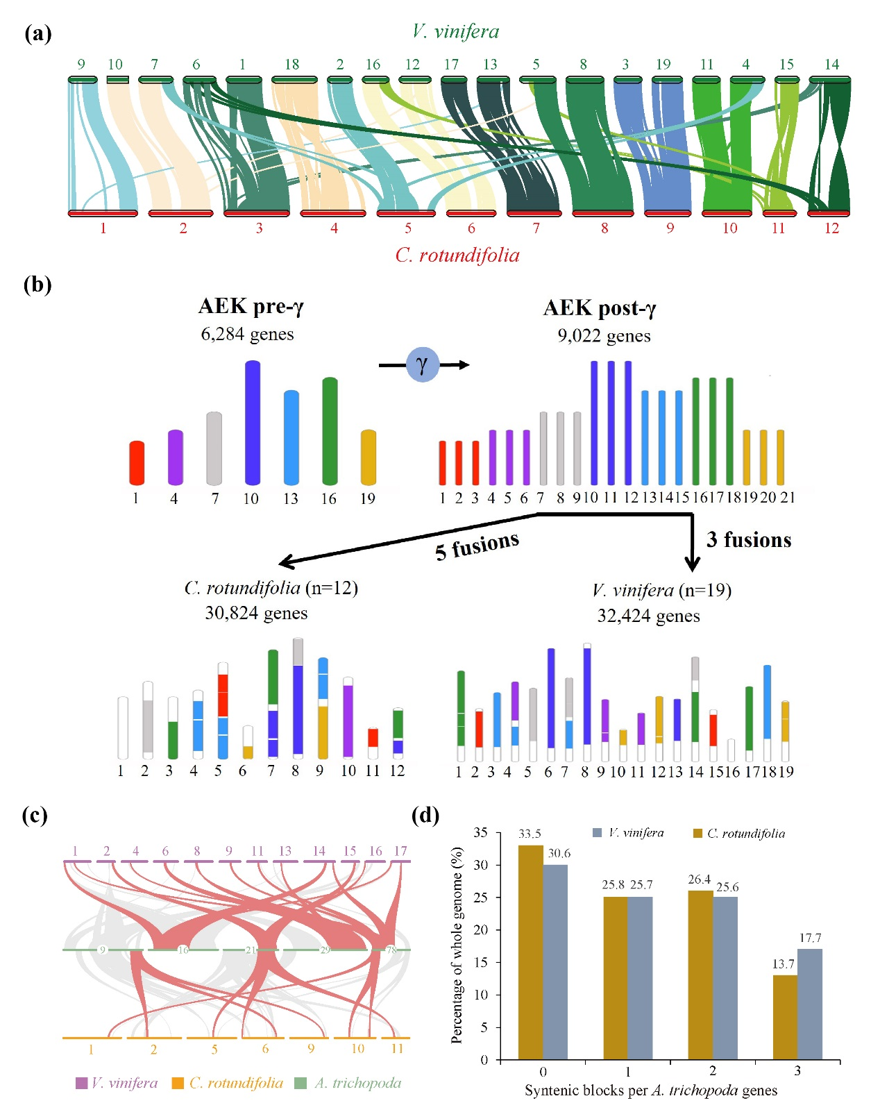 研究发现,圆叶白粉藤约在60.19–84.68百万年前与葡萄发生分化。其基因组并未发生独立的加倍事件,其较小的基因组可能与约在9.7万年前发生过一次转座子爆发和有效偏好性的转座子消除有关。与葡萄染色体的共线性以及祖先核型预测分析表明,圆叶白粉藤分化过程中发生过多次染色体重排和染色体片段复制事件。与葡萄相比,圆叶白粉藤中显著扩张的基因家族如:HSP-20, NBS-LRR等可能与其适应干旱生境有关。景天科酸代谢途径(CAM)关键酶展示出明显的昼夜表达节律,支持了圆叶白粉藤中存在高水分利用效率的CAM代谢,为研究葡萄科中CAM途径的起源提供了线索。此外,文章还就多肉植物在功能基因家族的共进化方面进行了分析和讨论。