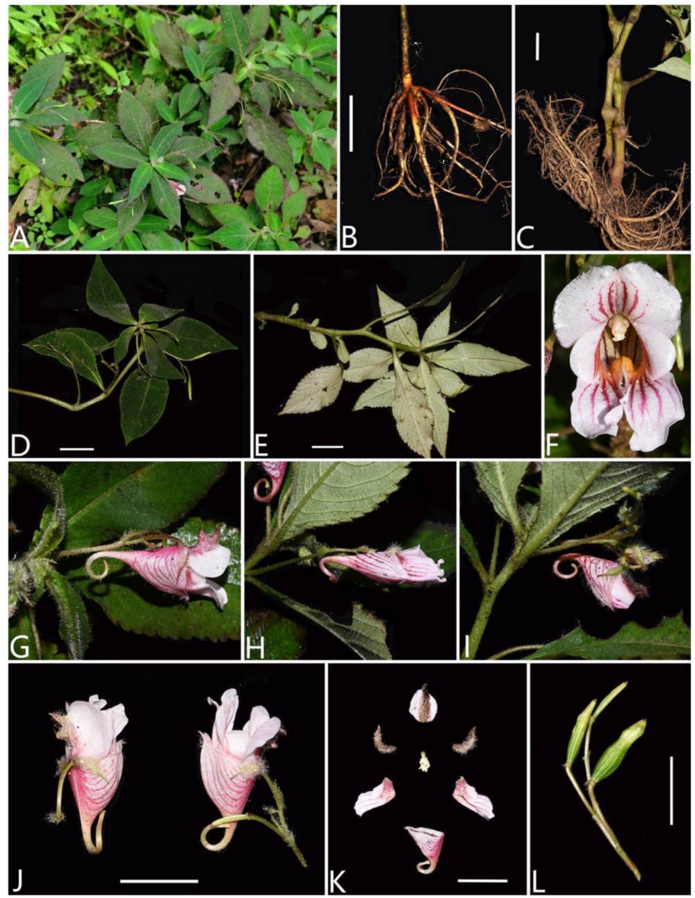 姚家坪凤仙花于2021年7月在云南省泸水市被发现,形态上近似于丝序凤仙花(Impatiens sterilis Y.Y.Cong & Y.X.Song),但可以通过它长圆形或卵状长圆形的叶片,具1–3对棒状腺体的叶柄,多少被毛的花梗,宿存的苞片和笔直的距等特征进行区分(图1)。隆阳凤仙花于同年10月在云南省保山市被采集到,它在形态上与上江凤仙花(I. shangjiangensis Y.Y.Cong & J.Z.Gu)相似,但可以通过它不带有腺体的叶柄,卵状披针形或披针形的叶片,更短的花梗,卵形的苞片,更长的距,近圆形的旗瓣等特征区进行区分(图2)。系统发育分析结果表明它们均属于本属总状花序组(I. Sect. Racemosae)。