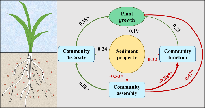 武汉植物园环境基因组学学科组与长江科学院流域水环境研究所林莉团队和南丹麦大学生物系徐亘博老师开展合作,研究了亚微米塑料(100和1000 nm)在长期暴露下对沉水植物苦草(Vallisneria denseserrulata)的植物毒性,并重点关注对根际微生物群落和微生物生态过程的影响。研究结果表明沉积亚微米塑料(0.1% w/w)显著抑制了苦草的生长,并影响了根际微生物的群落结构、多样性和相互作用关系。此外,亚微米塑料造成根际微生物群落组装的随机性下降,与碳氮循环相关的微生态过程受到抑制。这项研究为亚微米塑料对水生植物的长期间接效应提供了新见解,强调了沉积亚微米塑料通过干扰根际微生态过程对沉水植物构成威胁。