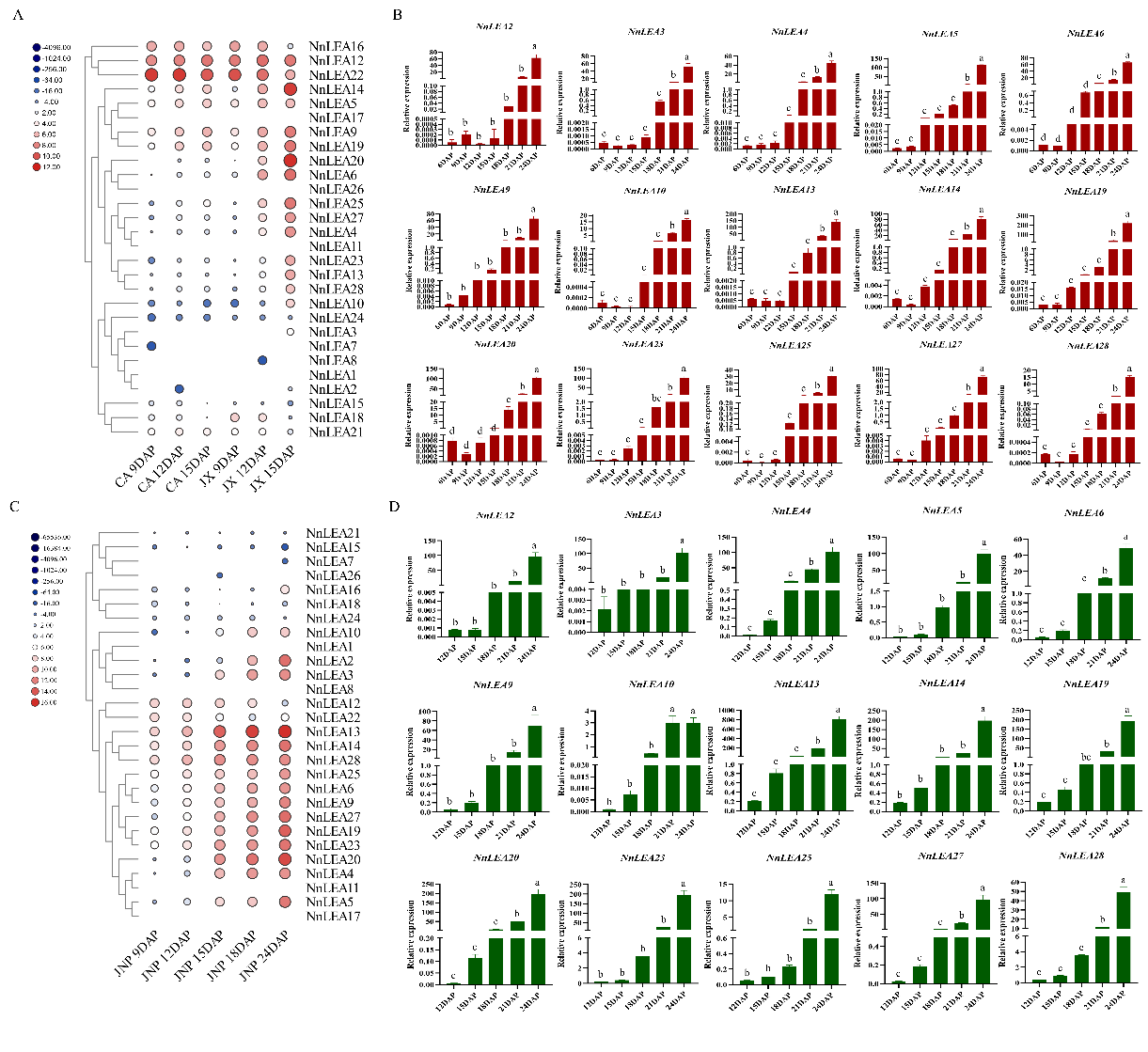 (A)莲子子叶发育和(B)莲子心不同发育期间NnLEAs的表达模式。qRT-PCR分析不同时期莲子子叶(C)和莲子心(D)中NnLEAs表达模式。