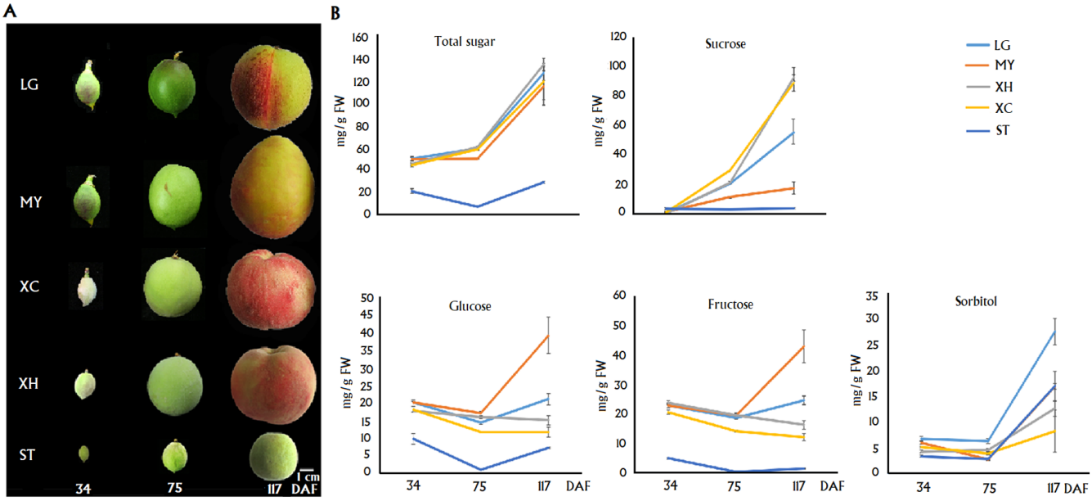果实糖分积累是园艺作物尤其果树的重要农艺性状。糖分决定果实的风味口感和营养品质;另外还可以作为调控信号促进花青素等次生代谢物的合成。桃作为我国的重要经济果树,大部分栽培品种果实以积累蔗糖为主(可达总可溶性糖的80%)。栽培种的果实糖表型分离不足(可溶性固形物在11%~14%之间),限制了正向遗传学方法分离到的糖候选基因数量。为揭示这一重要农艺性状的机制,中科院武汉植物园果树分子育种科研团队选择和栽培种表型差异大的野生近缘种作对照,采用转录组和糖组分含量偶联分析方法,发掘了糖积累的关键候选基因。