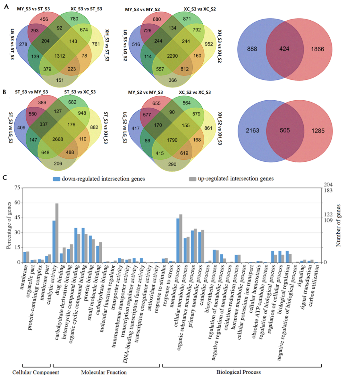 图2 与总糖含量相关的差异基因分析,A:表达量与总糖含量正相关的424个基因;B:表达量与总糖含量负相关的505个基因;C:差异基因的GO注释条目