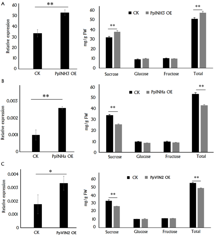 图3 PpINH3、PpINHa和PpVIN2瞬时转化对桃果实糖分含量的影响